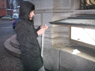 Yeliz Palak richtet im Schaukasten ihren Info-Leuchtkasten ein.