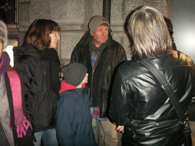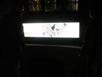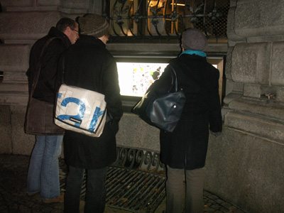 Besucherinnen der Eröffnung vor dem Schaukasten.